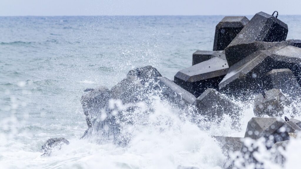 台風が接近すると海は大荒れになり、普段は穏やかな浜辺にも猛烈な高波が押し寄せます。防波堤を超える波が道路や建物に達し、破損や浸水を引き起こす可能性もあります。