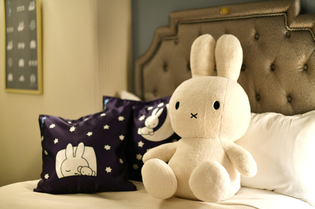 ミッフィーの世界観を再現した客室には、70cmサイズの大きなぬいぐるみや