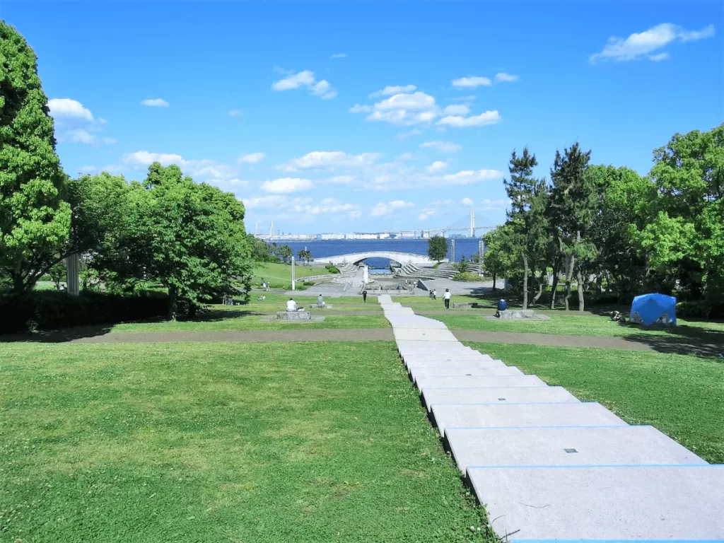 みなとみらい21地区最大の臨港パークでは、広い芝生と海、横浜ベイブリッジを楽しめます。