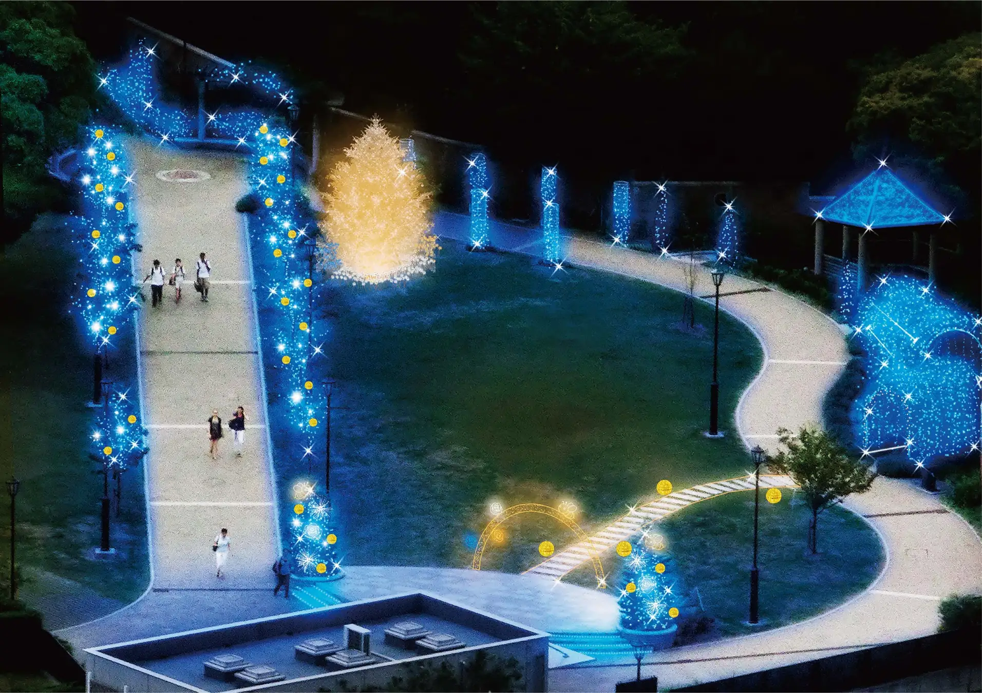 - ミツバチをテーマにしたイルミネーションで園内が光に包まれる冬のライトアップ