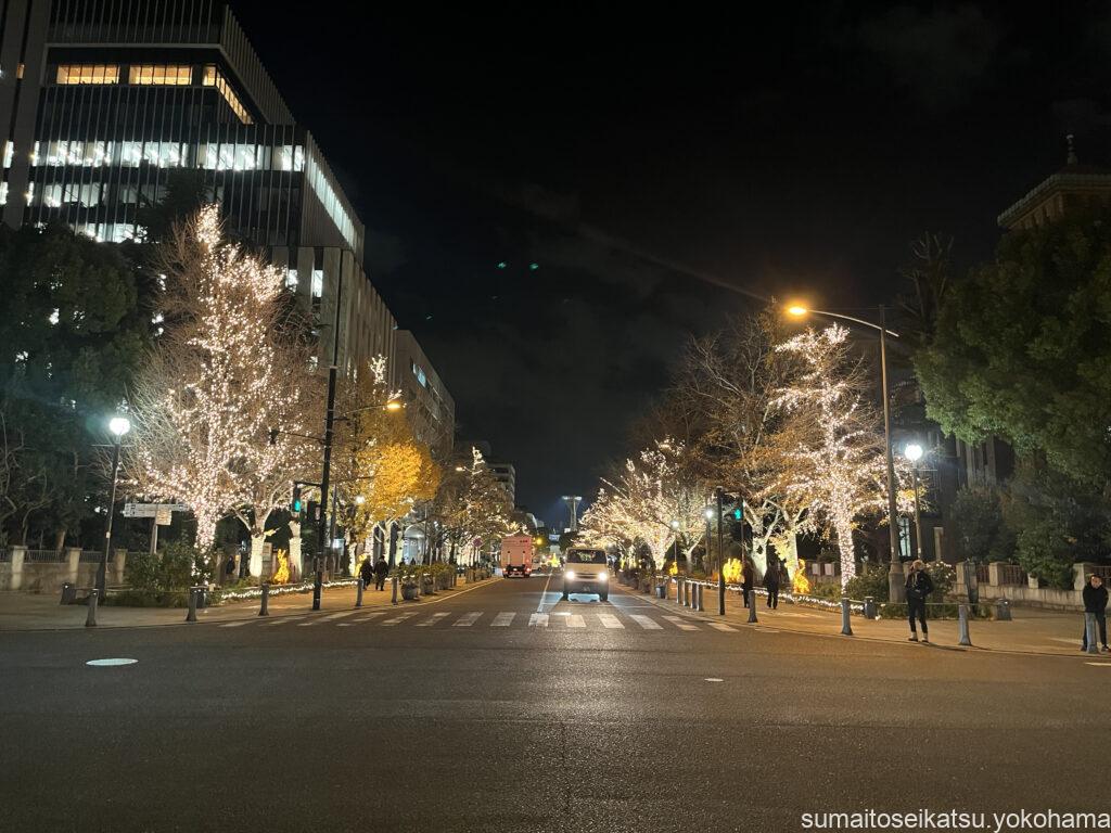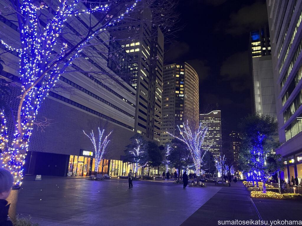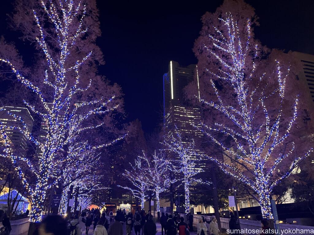 ここからみなとみらい方面へ続く道には、青色のイルミネーション並木が広がっています。これが「ヨコハマミライト」の一部で、約1.5kmにわたって約25万球のブルーを基調としたLEDライトが輝いています。