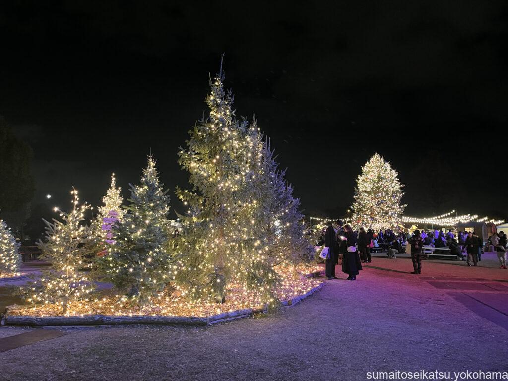 秋には銀杏並木が美しいこのエリアですが、この時期はイルミネーションで装飾されています。今年は横浜公園(横浜スタジアム隣接)で「BALLPARK Xmas YOKOHAMA KANNAI 2025」が初開催。入場無料でクリスマスマーケットが楽しめ、巨大なホワイトクリスマスツリーも登場しています。