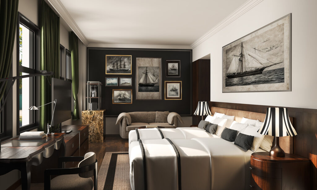 2027年1月開業予定のホテルでは、「世界の港」をテーマにした客室が7タイプを完備。