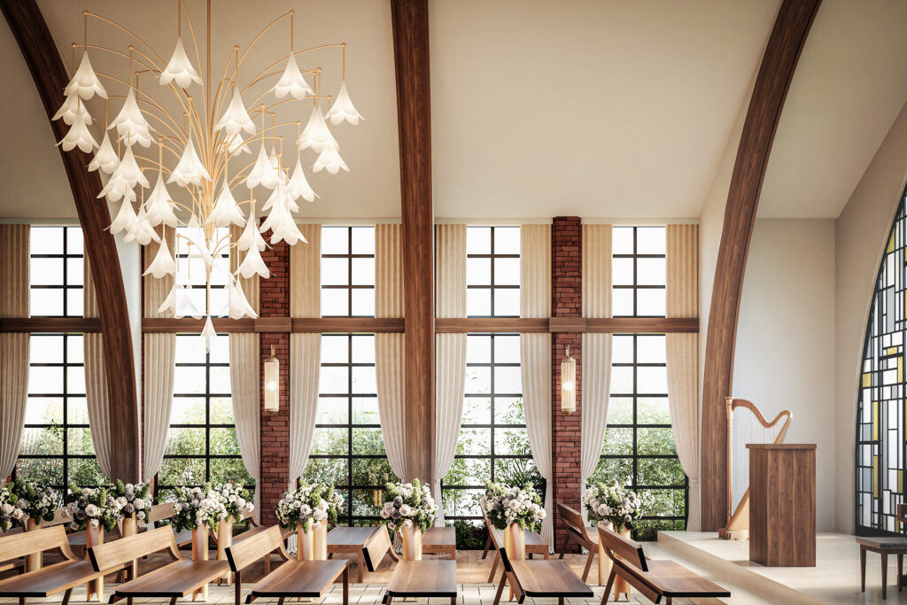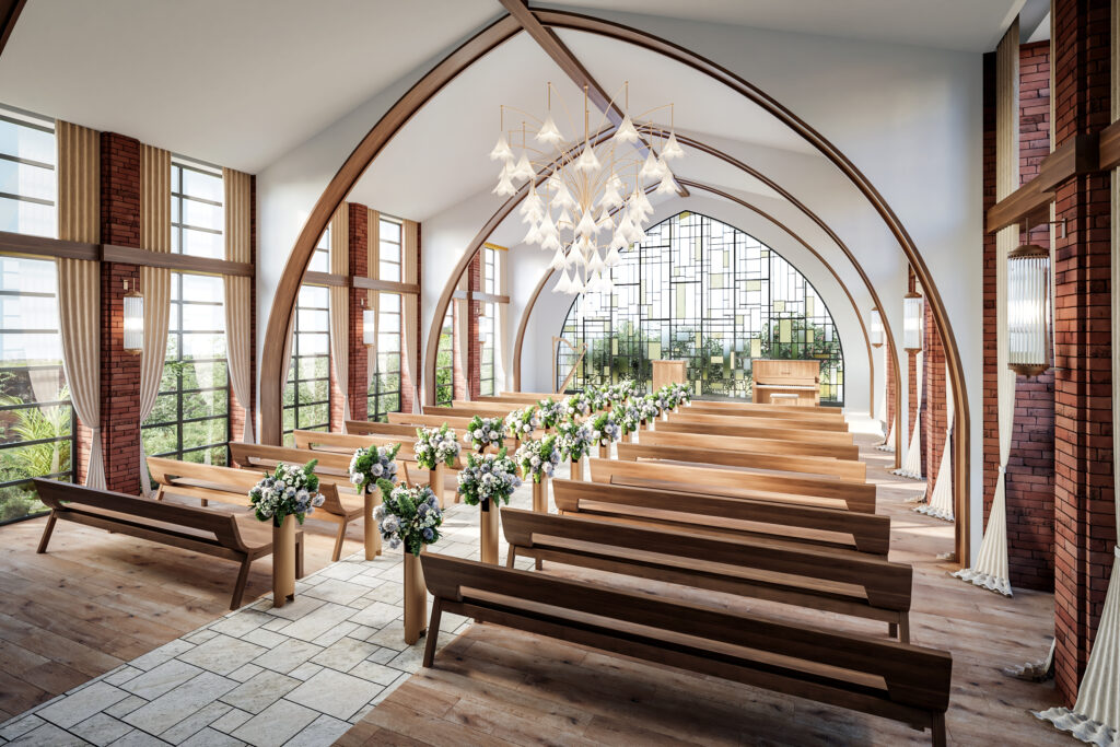 天井から自然光がたっぷりと降り注ぎ、窓からは緑が望めるチャペルを用意。