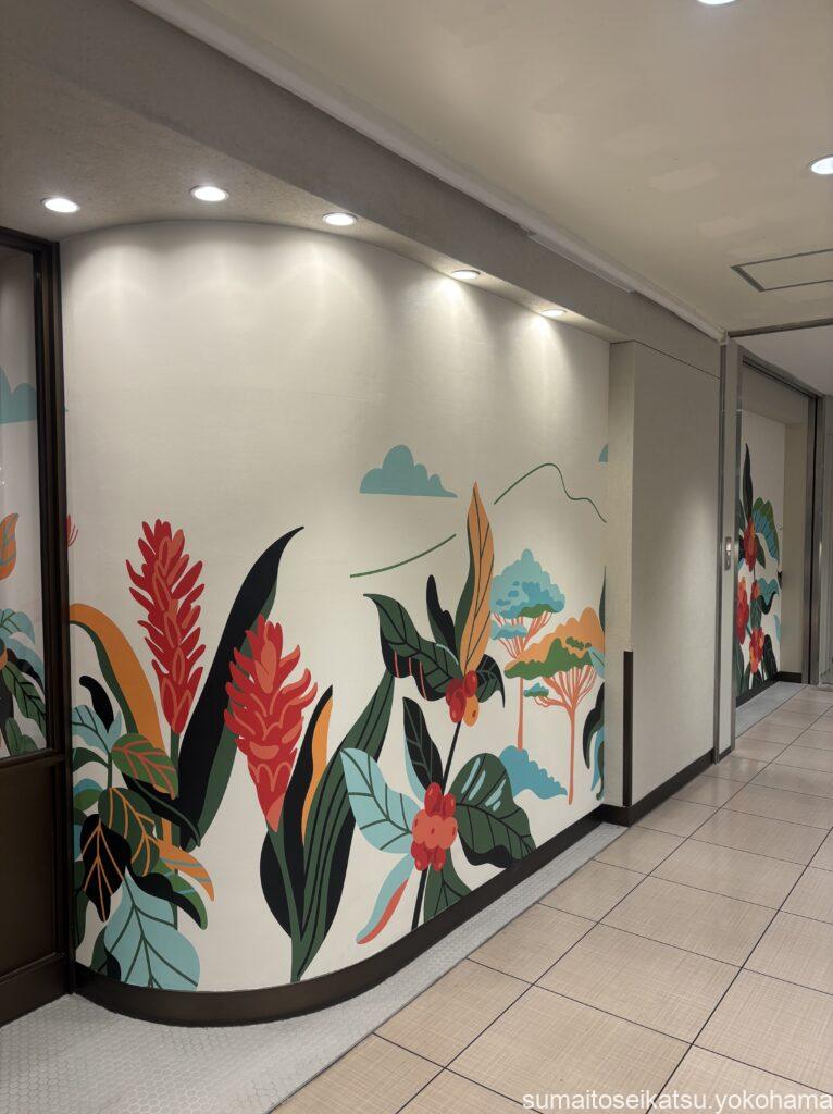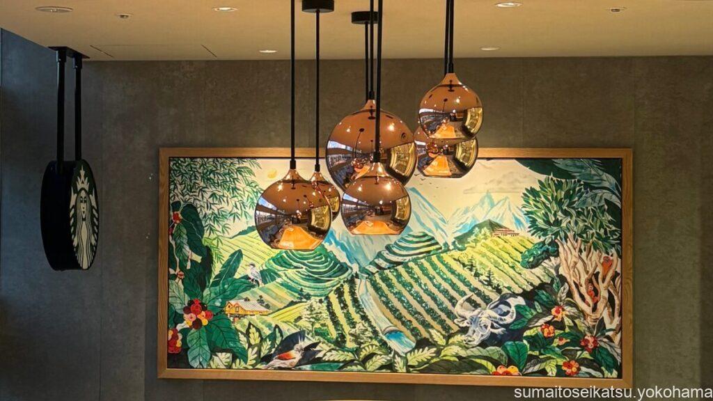 店舗にある3枚のアートは、「コスタリカの動物園」「シアトルのスターバックス 1号店があるパイクプレイスマーケット」「中国雲南省のコーヒー農園」が飾られています。また、店外から店内へと描かれたコーヒーチェリーのアートが空間全体に明るく、あたたかみのある雰囲気を演出しています。