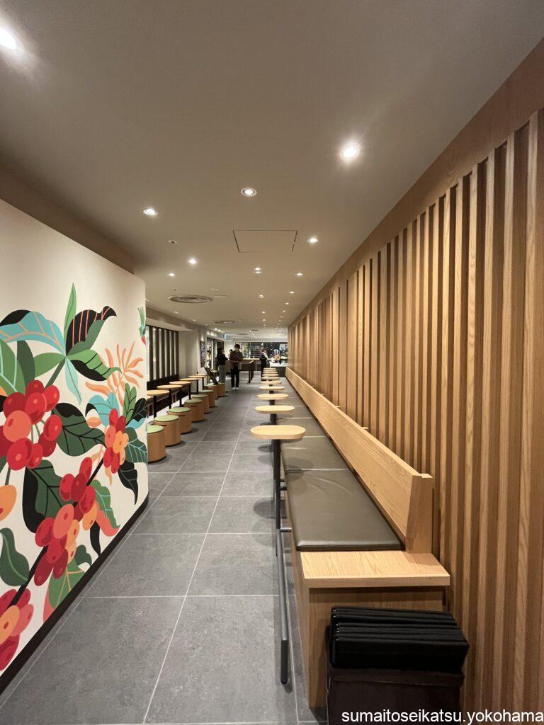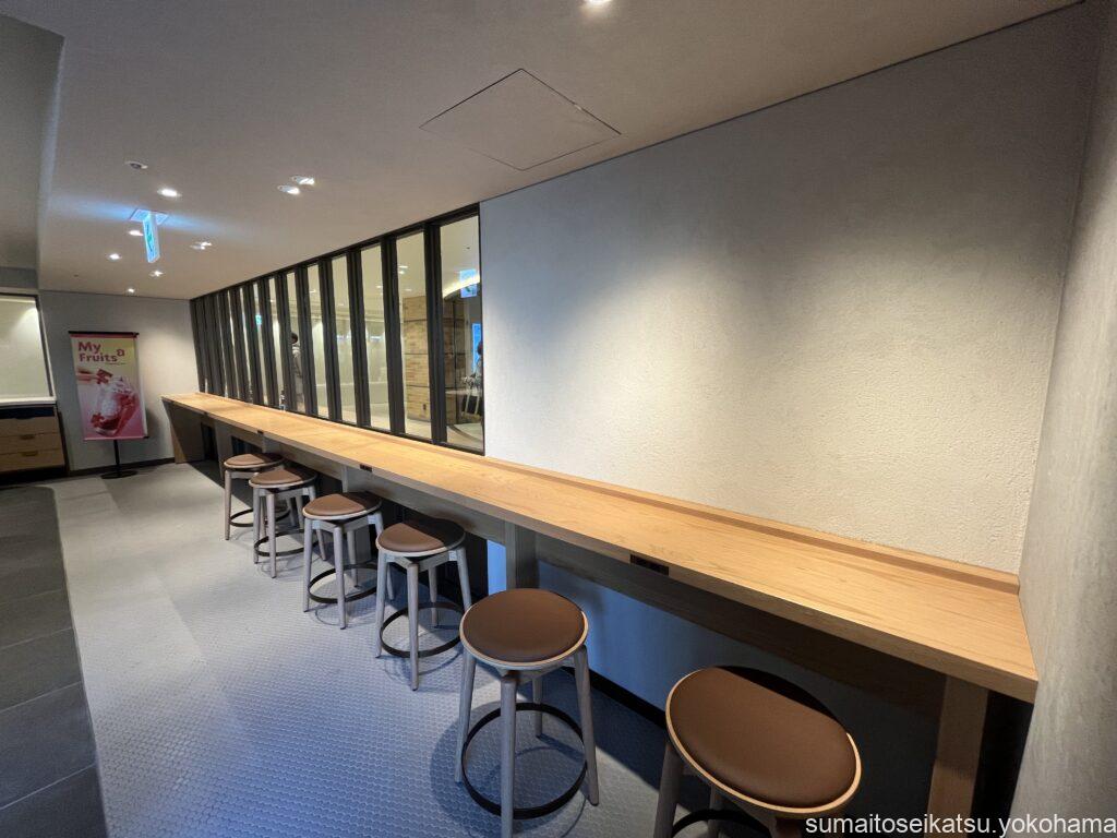 このスタンド席からは、ジョイナスの階段や相鉄の改札方面に向かう窓があります。行き交う人の流れを眺めながら、横浜駅の賑わいを感じられる特等席です。一人でコーヒーを楽しみたい時間にも、短時間でリフレッシュしたい時にも活躍してくれそうです。