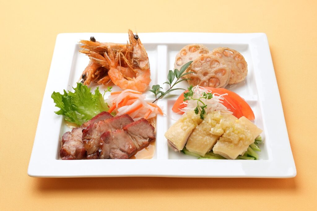 姉妹店の「萬珍樓點心舗」では「春節前菜盛り合わせ」も提供しています。クラゲは金銭、蒸し鶏は吉、チャーシューの紅い色は魔除け。一皿にさまざまな開運の意味が重ねられた、いわば「食べるお守り」のような前菜です。