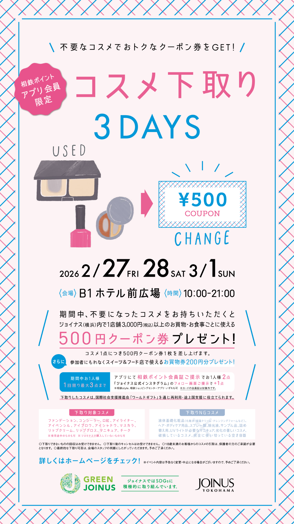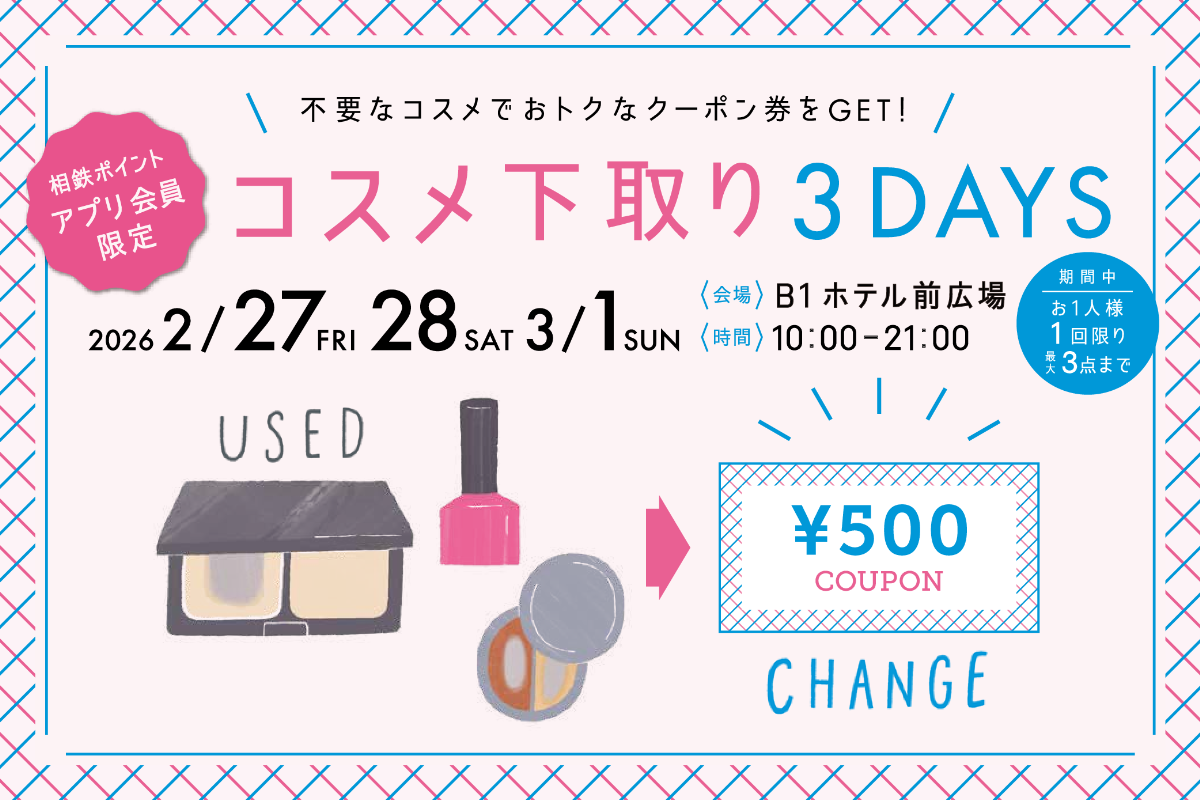 ジョイナスは、DGs取り組みの一環として、2026年2月27日(金)~3月1日(日)までの期間、「コスメ下取り3DAYS」を開催いたします。不要になったコスメをお持ちいただきアプリにて相鉄ポイント会員証をご提示いただくと、ジョイナス内でお買物・お食事ごとに使える500円クーポン券と交換いただけます。