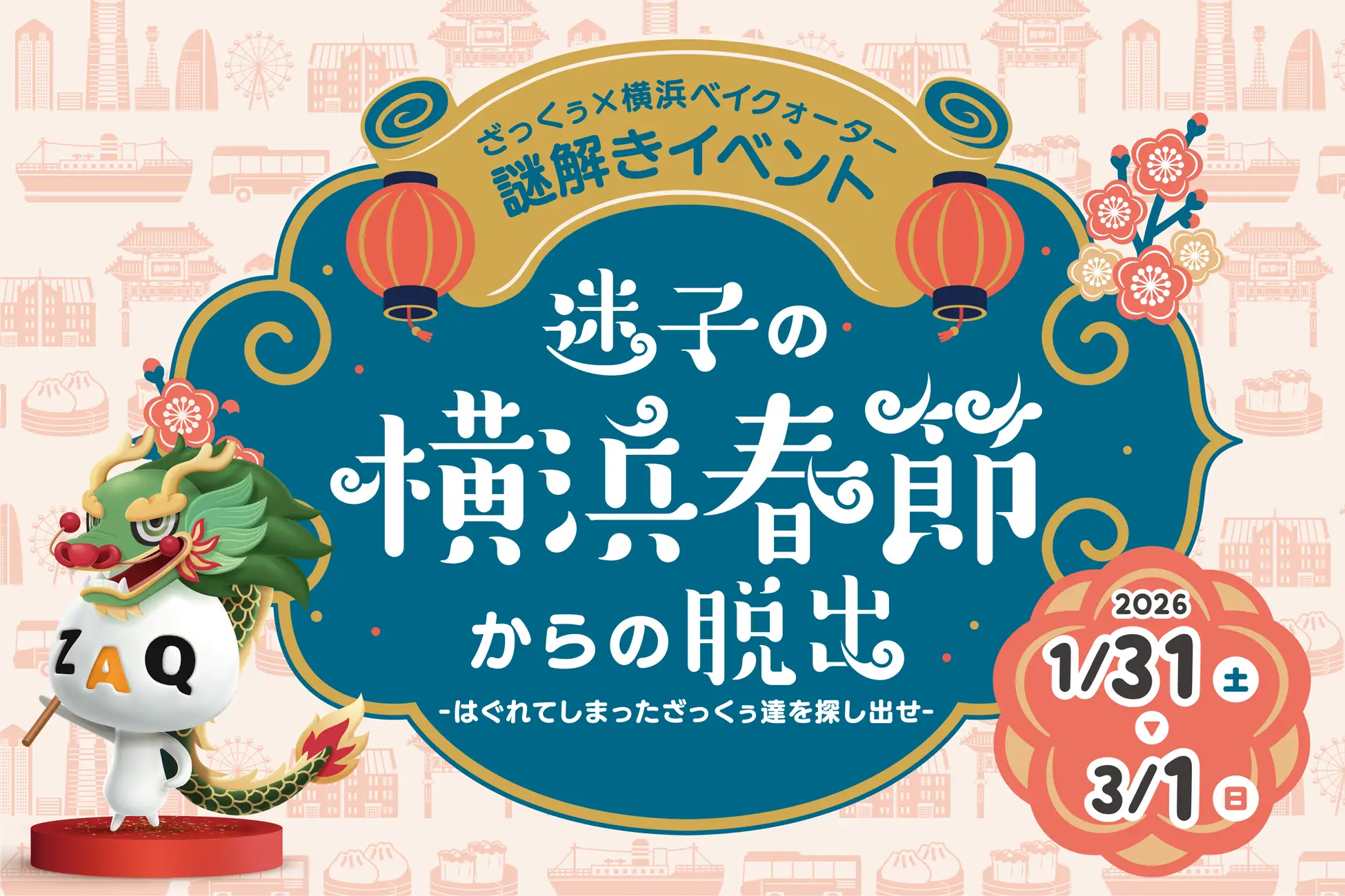 横浜駅東口直結の横浜ベイクォーターでは、3月1日(日)までの期間限定で謎解きウォークラリー「迷子の横浜春節からの脱出」を開催されます。館内に設置された5つの謎を解きながら迷子になってしまった人気キャラクター「ざっくぅ」たちを探し出す参加型イベントです。参加は無料で、子どもから大人まで楽しめる内容となっています。すべての謎をクリアした方には、各日先着でオリジナルポーチのプレゼントがあります。